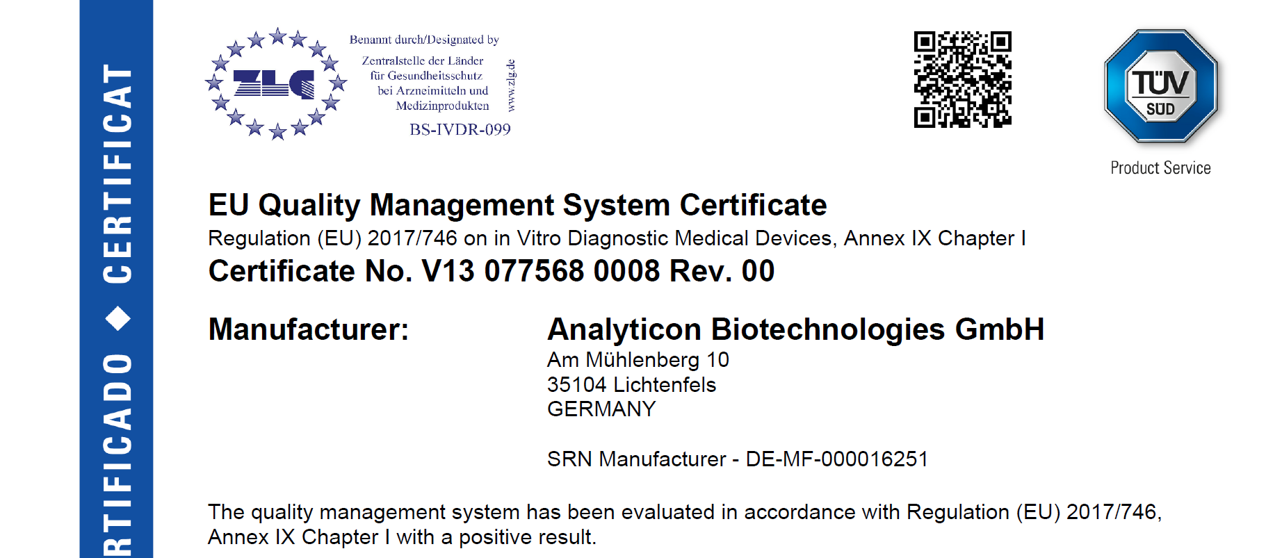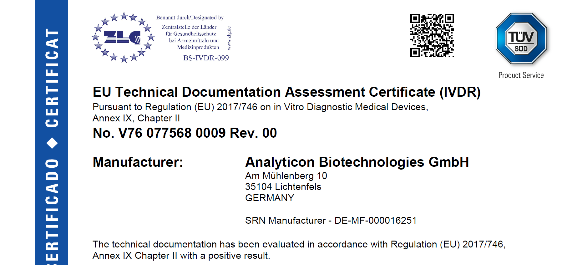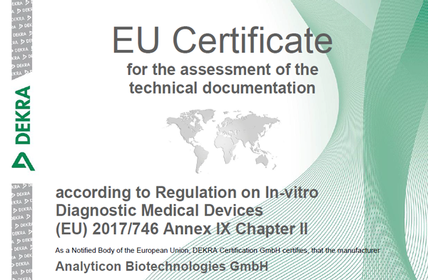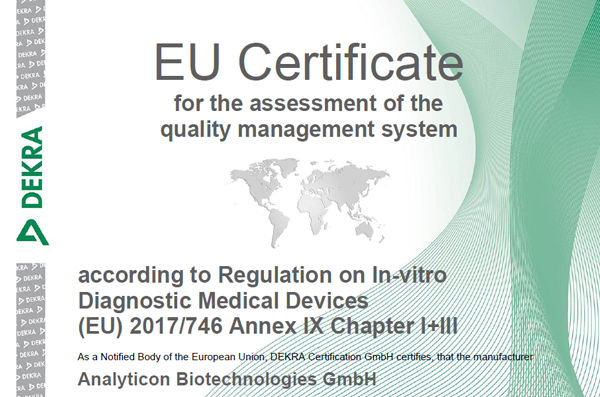 Furthermore, Analyticon regularly participates in external ring trials and has registered portions of its portfolio with national authorities (e.g., the Chinese National Medical Products Administration (NMPA), Scandinavian Laboratory Equipment Assessment Authority (SKUP), College of American Pathologists (CAP)).