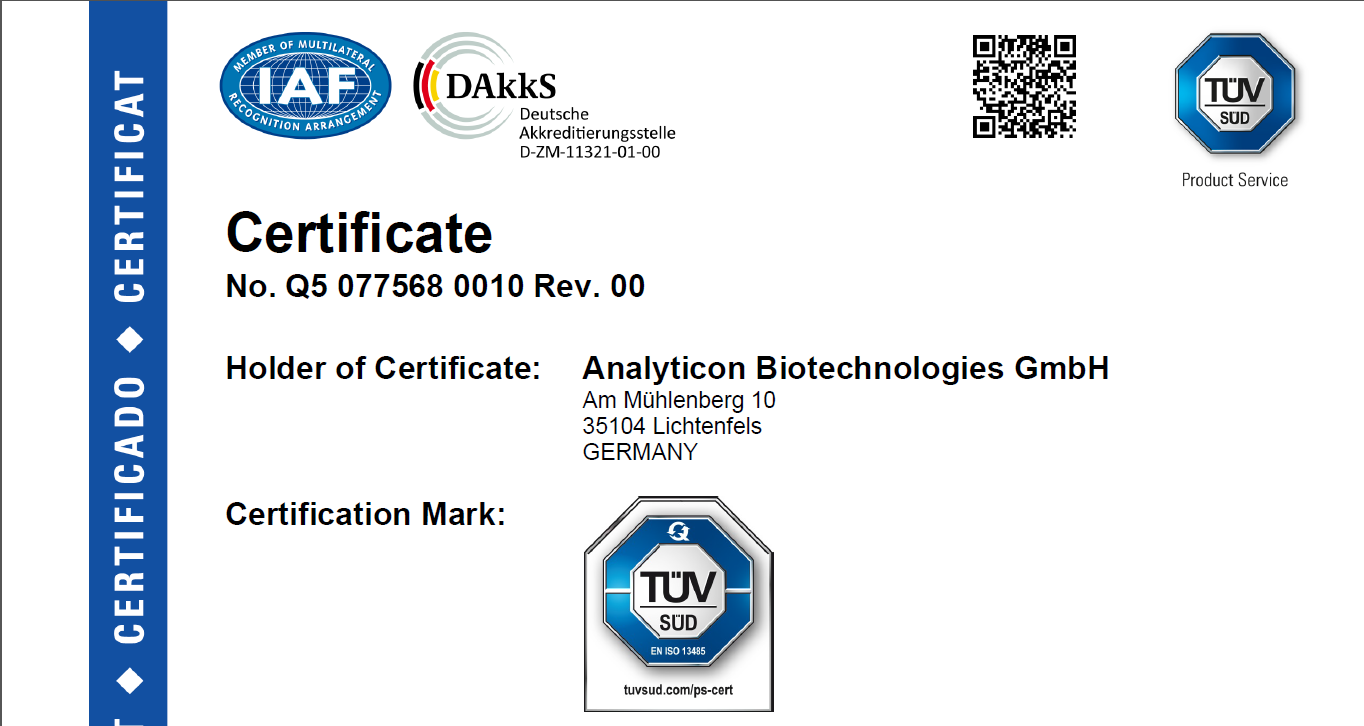 Unser Qualitätsmanagementsystem entspricht der international gültigen Norm EN ISO 13485:2016 + AC:2018 + A11:2021 und der IVD-Verordnung 2017/746. Wir garantieren eine lückenlose Qualitätskontrolle der Entwicklung, der Produktion und des Vertriebs. Unsere Produkte erfüllen alle strengen Qualitätsstandards der IVD-Verordnung 2017/746.